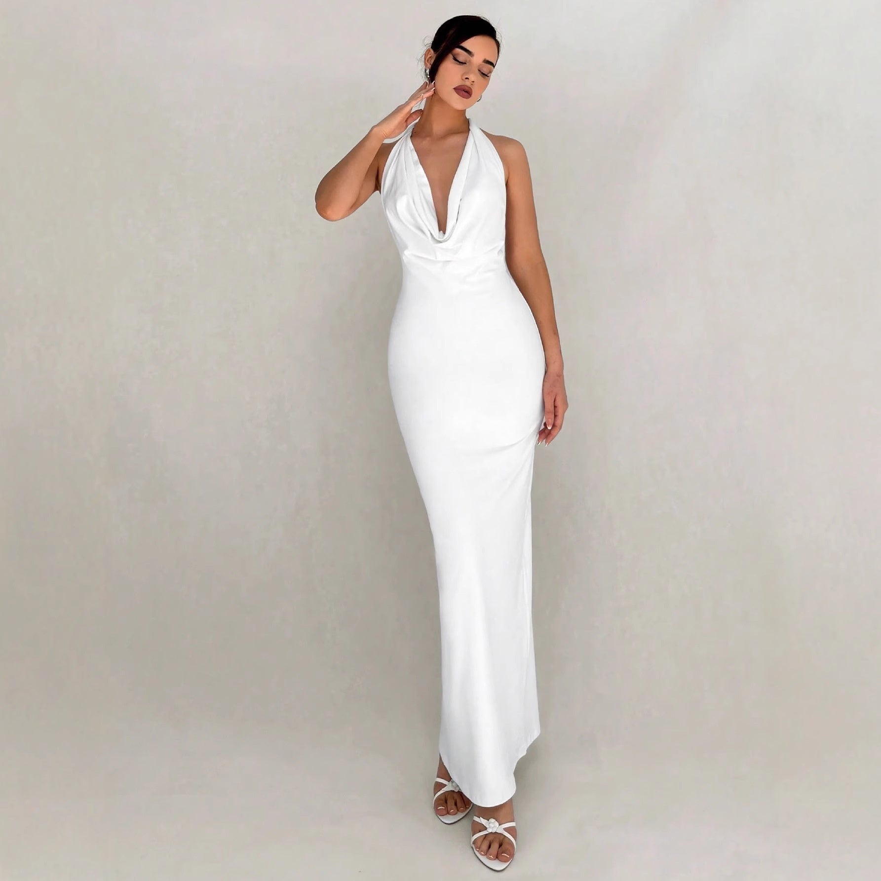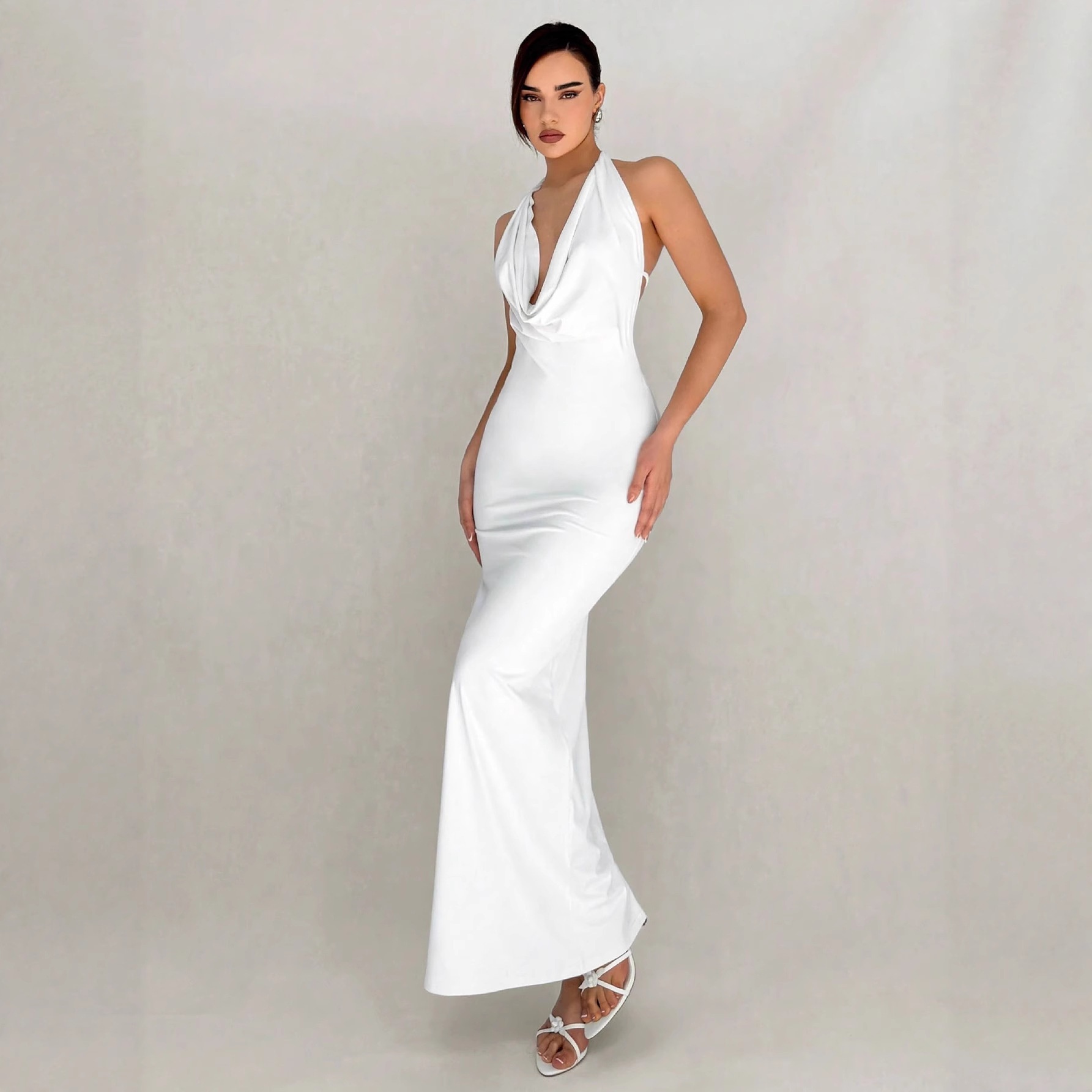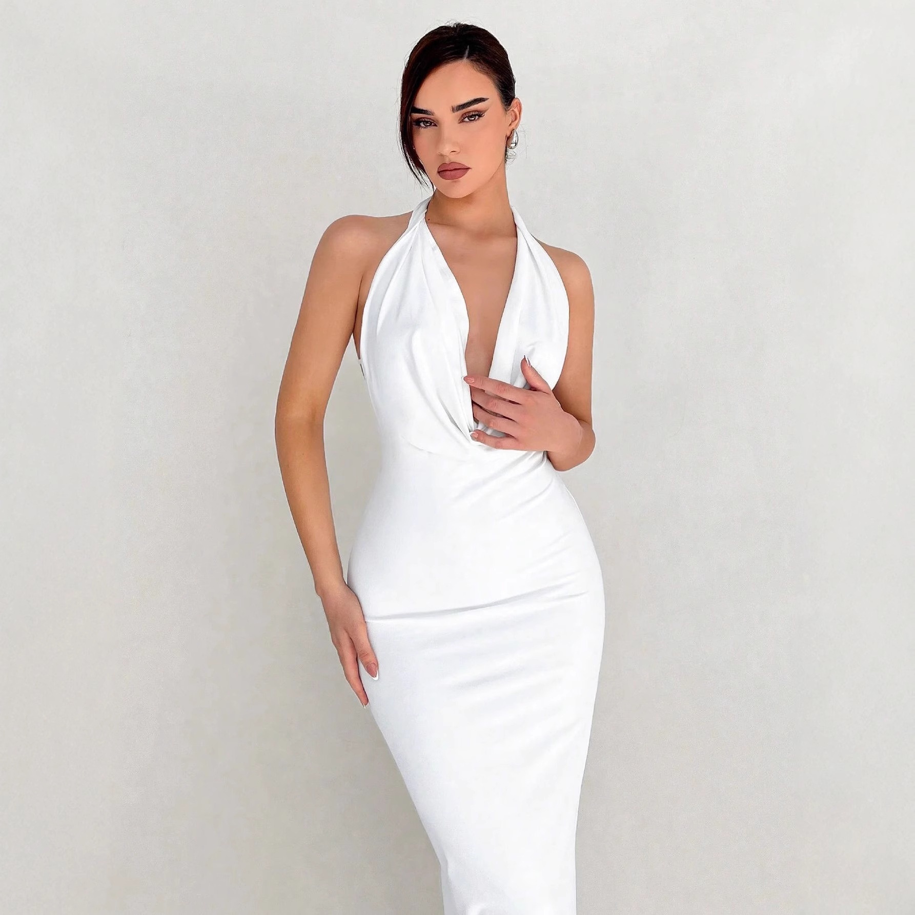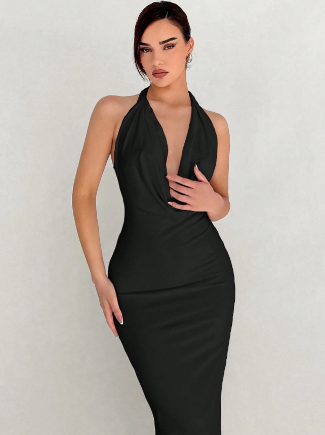 European And American Sexy Slim-fit Design Long Dress Solid Color